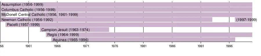 The Central Wisconsin Catholic Conference was formed by six parochial high schools in central Wisconsin in 1956. Original members were Assumption in Wisconsin Rapids, Campion Jesuit in Prairie du Chien, Columbus Catholic in Marshfield, McDonell Central Catholic in Chippewa Falls, Newman Catholic in Wausau and Pacelli in Stevens Point.[1] Two other high schools were also part of the initial group (Aquinas in La Crosse and Regis in Eau Claire), but originally were not slated to join until 1957 because of previous athletic commitments.[2] Madonna in Mauston and Maryheart in Pittsville were also invited to join the conference but declined due to smaller enrollment compared to the other eight schools.[3]