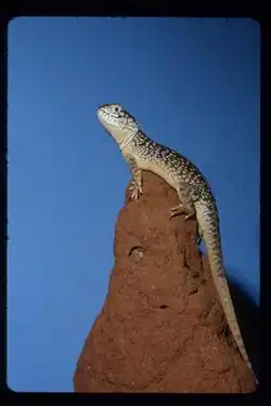 Central netted dragons are burrowing, diurnal (day-active), and terrestrial (ground-dwelling), spending their days basking on logs, stones and termite mounds. Like the majority of reptiles, they are ectotherms, relying on their environment to regulate their body temperature (that averages 36.1 °C).[3] A dragon's day will start with basking in the sun to raise its body temperature to gain energy. Without adequate body heat, these lizards cannot digest their food.[2] When the desert temperature peaks in the middle of the day, they will either retreat to their burrows to cool down, or climb plants to escape the extreme heat.[3]