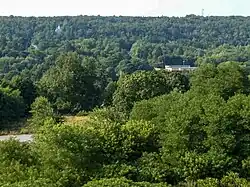 The Centralia Municipal Building still stands, along with its attached fire station garage. By the early 2010s, the building had fallen into disrepair, but new siding was installed in 2012.[45] The building hosts the annual Centralia Cleanup Day, when volunteers collect illegally dumped trash in the area. Although past cleanup days avoided fire-impacted areas,[46] the 2018 cleanup included areas around the landfill and the abandoned section of PA Route 61.[31] Volunteers planted 250 apple trees around Centralia to restore the town's ecosystem and wildlife habitats in April 2021.[47]