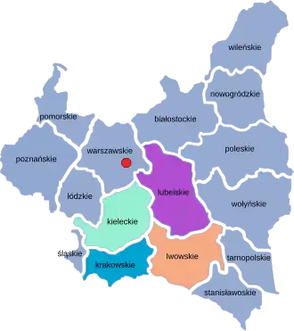 The COP was located in the territories of the following former voivodeships: the eastern parts of Kielce Voivodship and Kraków Voivodship, the southern part of Lublin Voivodeship, and the western part of Lwów Voivodeship, or in other terms, 46 powiats, constituting 15.4% of the territory of Poland and inhabited by 17% of Poland's population. The urbanization factor of those territories was 17% (94 cities), compared to the national average of 30%. There were several arguments for the location of the COP: