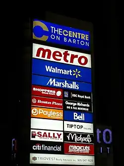 The Centre Mall owners announced the plans for a 23-building power centre, named The Centre on Barton, on the property of Barton Street East. The cost had originally been estimated to be around the $100-million mark and the project eventually took up 700,000 square feet (65,000 m2) of retail space. This was the largest redevelopment project in the history of Hamilton's east-end. The buildings on the property are grouped around the edge of the property and create a pedestrian-oriented design rather than a commercial island in a sea of parking.[2] The overhaul roughly took about two-and-a-half years to complete but the bulk of the work had been done by the end of the summer of 2008. Some new buildings were completed before the enclosed mall was torn down.[3]