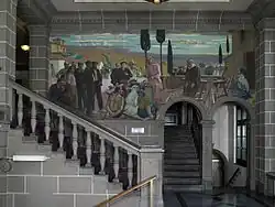 In 1995, the Centre became the headquarters of the World Trade Organization (WTO), that is the current tenant of the building. In 1998 a conference centre was built next to Rue de Lausanne, by the Swiss architect Ugo Brunoni. In 2007, following research conducted at the ILO archives and WTO locations, various hidden artworks were rediscovered and exposed to visitors.[2] After the creation of the WTO, the organization lacked space for staff and delegates for their daily meetings. After considering several options, the Swiss authorities and the WTO have reached an agreement in early August 2008 to renovate, extend and improve the Centre William Rappard. This was the best solution in terms of cost and efficiency. In 2008 the renovation and extension of the building was approved by the Swiss Confederation. Works started in 2009, and added an extension providing 300 new work posts (out of total 1,200 potential places in the whole building) and an underground car park with 200 places).[3] Furthermore, the original building was fully renovated to add more working space for staff members, delegates and visitors. Works were performed in three phases: 2008–2011, renovation of the General Council Room, modernization of infrastructure (electricity, plumbing, heating), and creation of new rooms. 2010–2012, densifying and increasing the indoor capacity, including the Atrium in the former north courtyard and large meeting rooms in the south courtyard. 2011-2013: construction of the new building between the former south parking and the park.