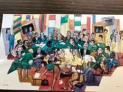 In October 2019, after a heated debate and strong resistance by many WTO staff members and delegates, the caricature painting In GATT We Trust by the interpreter and artist Claude Namy was removed from the entrance hall and sent to an underground deposit. The painting (1.10 m high, 1.85 m wide, acrylic on canvas) dates from 1966. It is a humorous depiction of a meeting at the GATT Secretariat in Geneva during the Kennedy Round period (1964-1967). Director-General Eric Wyndham White is seen at the head of a u-shaped table addressing the audience. Around the table are GATT Secretariat officers and delegates from member countries (the "contracting parties"), all of them sitting at the table, as well as interpreters, assistants, secretaries and ushers. The four women are standing and supporting the work of the male ambassadors and officers. In the foreground, the chief interpreter holds a folder and casts a surreptitious glance at the buttocks of one of the female assistants. The humorous intention is condensed in the legend inscribed on the bottom of the illustration, “In GATT We Trust”, which is a witty paraphrase of “In God We Trust”, the official motto of the United States of America and the Republic of Nicaragua. Furthermore, the artist reproduced the motto in a way that the capital “T” of Trust is placed at a lower level than the text, leaving the title to be read as “In GATT We Rust”. This painting "was on display for 30 years in what is now Room Y, in the small cafeteria. It was removed in 2007 to uncover Eduardo Chicharro’s Pygmalion, and was then placed at the service entrance and, after the renovation, in the Delegates Room. In 2013, it was finally hung in Room B" [9] By June 2019, within the context of the MeToo movement, negative perceptions arose among staff members. The painting was removed from Room B and later placed in the access of the main entrance hall to the lakeside terrace. After several internal discussions that were dominated by the gender debate, the Director-General Roberto Azevêdo decided that the painting should be removed, which was done on 2 October 2019. This occurrence of art censorship was later followed by Keith Rockwell of the WTO information and media relations division when he asked to delete what he considered sensitive information from the manuscript of a book chapter dedicated to the removal of In GATT We Trust.[10]