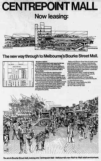 - ^ a b [Cartographic material] Centrepoint Shopping Arcade, Public Building No. 17534 Plan 2805. R. Barnard Brown & Associates. 1977–81 – via Public Record Office Victoria.