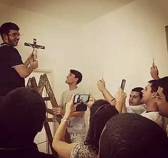 Public recitation of the rosary in support the organization's agenda is a recurring practice that has sometimes put them at odds with the Catholic hierarchy. In 2017, the group organized a rosary in reparation for an Afro-rite mass traditionally celebrated at the Church of the Sacred Heart of Jesus on the occasion of Black Awareness Day, claiming that the celebration was sacrilegious and contrary to the rubrics in force for the Roman Rite of the Catholic Church.[46] The rosary, recited loudly inside the church during the mass, caused uproar among some of the faithful present, and the police were called to quell the disturbance, resulting in the indictment of five individuals associated with the center for religious intolerance.[47] In the year following, the Afro-rite mass was revoked by the Archbishop of Rio de Janeiro following the group's request and has not been celebrated since.[46][48]