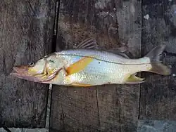This fish is generally up to 25 cm long, but it has been known to reach 72 cm. The maximum published weight is 5 kg.[3] Like other snooks, it has a large head with a long, pointed snout and large, laterally positioned eyes. The large mouth has bands of villiform teeth. The body is yellowish brown to brownish green in color. It has a silvery sheen on the sides and belly and a dark line along the lateral line.[4]