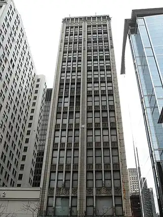 The building has also served as home to the headquarters of the Gideons International,[13][14] Local 66 of the Elevator Operators and Starters Union,[15] the main offices of Sterling Cleaners and Dyers,[16] the Audit Bureau of Circulations,[17][18][19] a Liggett's drug store,[20] Family Loan Corporation,[21] May Jewelers,[22] Romas Restaurant,[23][24] the Illinois Migrant Council,[25][26] the National Alliance of Black Feminists,[27] and the local office of the Guardian Angels.[28]