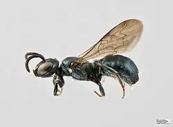 Ceratina calcarata, the spurred ceratina, is a species of small carpenter bee in the family Apidae.[1][2][3][4] It is found in eastern North America.[1] This species ranges from Georgia, USA north to Ontario, Canada and east to Nova Scotia, Canada. [5] This bee is a common generalist, native pollinator, [6] it pollinates plants like watermelon and cucumber very effectively. [7] C. calcarata adds to the productivity of a wide range of ecological and agricultural systems due to its wide range and abundance. [6] This small bee is becoming a model organism in the scientific research of social evolution. [6] C. calcarata is the first subsocial bee species to have its genome published, allowing researchers to investigate the evolutionary origins of social behaviour. [8]