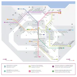 During the second half of the 20th century, Renfe operated several services on all the Iberian-gauge lines and circulated as suburban trains. They were popularly known as "cercanías", but Renfe did not have a specific structure for them.[2] This changed in the 80s when the company began plans to create a defined and organised service, which was inaugurated in 1989.[3][4]