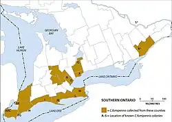 Emergence dates and speed of the life cycle vary across the wasp's broad distribution. In Ontario, the flight season typically begins the last week of June and continues until early September. Emergence dates and duration of flight season can be influenced by droughts, which could postpone emergence or shorten the flight season. Ontario colonies are associated with somewhat disturbed sites compacted by human activity such as baseball diamonds, parking areas, infrequently used roads, roadsides, footpaths and the soil around campfire pits.