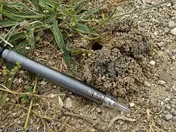 When hunting for buprestid prey, the maximum foraging range of the wasp is estimated at 2 km with an estimated average flight distance of 750 meters from the nest. Once prey has been found, a female wasp will typically attack a target beetle by alighting on it, climbing over it, and grabbing it by the thorax with her mandibles before inserting her stinger into the base of the beetle's leg (in the membrane of the coxal joint, a gap in the buprestid's armour) and injecting a paralytic venom. Once at the nest entrance or in the burrow, the female wasp will sometimes re-sting poorly paralyzed prey in the same joint.
