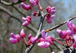 Cercis canadensis, the eastern redbud, is a large deciduous shrub or small tree, native to eastern North America from southern Michigan south to central Mexico, west to New Mexico. Species thrive as far west as California and as far north as southern Ontario.[3] It is the state tree of Oklahoma and the official city tree of Huntington Beach.[4] The prevalence of the so-called "Columbus strain" has seen the residents of Columbus, Wisconsin, embrace the plant in their city's identity.[5] Known as the "Redbud City," the town hosts "Redbud Day" annually the Saturday before Mother's Day, organizing a variety of themed events to recognize the tree.[6]