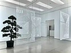 Along with other artists, including Liam Gillick and Thomas Demand, Evans was commissioned in 2007 to contribute a work of art to the newly opened Lufthansa Aviation Center in Frankfurt.[20] In 2010, he created five Light Columns for the illuminated entry portal of the K&L Gates Center in Pittsburgh, complemented by the neon wall sculpture Mobius Strip at the entry reception desk.[21] Commissioned by the Great North Run Cultural Programme in 2011, he unveiled Permit yourself..., a large-scale kinetic sculpture installation composed of double-sided glass panel mirrors, with an excerpt of text cut out of each mobile panel. That same year, the artist was commissioned to design a large-scale picture (176 m2) for the season 2011/2012 of the Vienna State Opera as part of the exhibition series "Safety Curtain", conceived by museum in progress. In 2017, Evans was selected to create the Tate Britain Commission. Displayed in the Duveen Galleries, "Forms in Space…by Light (in Time)" was made from almost 2 km of neon lighting suspended from the ceiling.