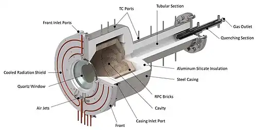 These types of reactors consist on a piece of solid material, which is shaped as a reticulated porous foam (RPC) in other to increase both the surface area and the solar radiation penetration.[15][16] This reactors are shaped as a cavity receivers, in order to reduce the thermal losses due to reradiation. They usually count with a quartz (fused silica) window in order to let the solar radiation inside the cavity.[17]