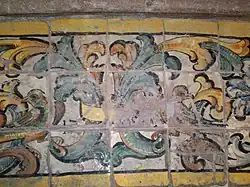 In the "new" Cerreto, there was a true ceramists’ quarter located near the Cerreto Sannita Cathedral. During the renovation of several buildings in that area, remains of kilns for firing terracotta and ceramics were found.[7] In this "ceramists’ insula," there were the workshops of Francesco Iadomaso, a Cerreto native, and Carlo Coluccio from Campobasso. In the same area was the workshop of Nicolò Russo, a master faenzaro who moved from Naples in 1693. Many young apprentices worked in his workshop, becoming the main figures of Cerreto ceramics in the 18th century: Domenico Marchitto, Santi Festa, Melchiorre Cerri, Nicola and Crescenzo Petruccio, Nicola Marchitto, Salvatore Paduano, and Giuseppe Paolino. Russo created numerous works in Cerreto Sannita, including several floorings in religious buildings.[5]