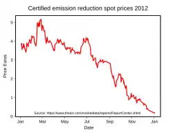 In August 2008, prices for CERS were $20 a tonne. By September 2012, prices for CERS had collapsed to below $5. This was in response to the Eurozone debt crisis reducing industrial activity and the over-allocation of emission allowances under the European Union Emissions Trading Scheme. The Economist described the Clean Development Mechanism as a "complete disaster in the making" and "in need of a radical overhaul".[3] The Guardian also reported the prolonged downward trend in the price of CERs, which had been traded for as much as $20 (£12.50) a tonne before the 2008 financial crisis to less than $3.[4] In October 2012, CER prices fell to a new low of 1.36 euros a tonne on the London ICE Futures Europe exchange.[5] In October 2012 Thomson Reuters Point Carbon calculated that the oversupply of units from the Clean Development Mechanism and Joint Implementation would be 1,400 million units for the period up to 2020. Point Carbon predicted that CER prices would to drop from €2 to 50 cents.[6] On 12 December 2012 CER prices reached another record low of 31 cents.[7]