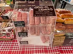 The local sausages of Lyon are, however, made to be cooked. One of the sausages, the cervelas, is produced short and fat with prime pork stuffing with either pistachios or truffles. It derives its name from brains, since it was initially made from pork brains. On the other hand, the sabodet, with its coarser texture, comes from Isère and is made from pork head, rind, and meat.[5]