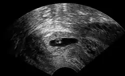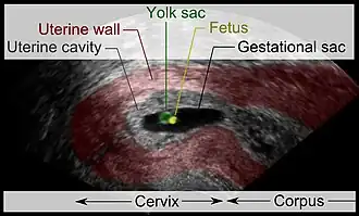 | Vaginal ultrasonography of a cervical pregnancy at a gestational age of five weeks. See image below for details of the visible structures.[1] | |