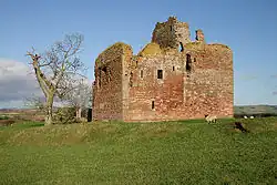 Cessford was built around 1450 by Andrew Ker, an ancestor of Robert Ker, 1st Earl of Roxburghe, and of the Dukes of Roxburghe. It is from this place that the Duke takes his subsidiary titles: Baron Ker of Cessford, and Marquess of Bowmont and Cessford. It is possible that the castle incorporates parts of an earlier structure. The fortalice was built on an L-plan, with a main keep with a wing of almost the same magnitude. With up to six storeys, two of which were barrel vaulted, and with walls up to 13 feet (4.0 m) thick, it was a formidable place of defence. The angle of the building was enclosed by a single-storey defensive gatehouse, and the whole was surrounded by a barmekin and defensive earthworks, a fact that is corroborated by the record of English troops having to use an escalade to gain access to the castle courtyard during the siege of 1523. The castle was besieged in 1523 by the Earl of Surrey who remarked: "It might never have been taken had the assailed been able to go on defending".[1] The castle was abandoned in 1650.