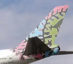 Ntcoxʼo was a member of the Ncoakhoe people, speakers of the Naro language,[1] and was born in the Ghanzi District of Botswana. She was a member of the Kuru Art Project.[2] In the early 1990s some of her work was shown in a gallery in London and seen by representatives of British Airways, who decided to purchase one of her pieces and to use it as the basis for a design in their ethnic livery scheme. A representative for the airline traveled to Africa to see her; in her telling, she was handed "a piece of paper and told...to make a cross". Despite the fact that she was illiterate, this transaction was held to be binding and to have caused her to transfer the rights to her work.[3] She received 12,000 pula for her work. At the time her husband was ill with tuberculosis and her daughter was unemployed, and she was responsible for supporting a large family.[4]