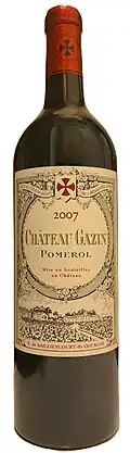 Château Gazin is a Bordeaux wine from the appellation Pomerol. The winery is located on the Right Bank of the Bordeaux wine region, in the commune of Pomerol in the department Gironde. As all wine produced in this appellation, Château Gazin is unclassified, but the estate has since the 1840s been estimated among the great growths of Pomerol.[1][2]