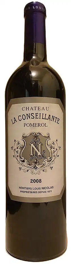 Château La Conseillante, previously Château Conseillante and simply La Conseillante, is a Bordeaux wine from the appellation Pomerol. The winery is located on the Right Bank of the Bordeaux wine region, in the commune of Pomerol in the department Gironde. As all wine produced in this appellation, La Conseillante is unclassified, but the estate is estimated among the great growths of the region.[1]
