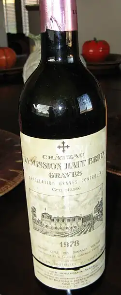 American wine critic Robert Parker awarded the maximum one hundred points for the 2000 La Mission Haut Brion,[8] making it six occasions Parker has given the estate this score.[9] Jancis Robinson, MW describes La Mission as "the quintessential insider's wine"[1] while David Peppercorn, MW holds the estate's consistent performance over the last century as justification to classify La Mission as a Premier Cru, as was done to Château Mouton Rothschild in 1973.[3][10] In 2009, the Liv-ex Bordeaux Classification considered Château La Mission Haut-Brion as a potential First Growth along with Château Mouton Rothschild and the four estates classified in 1855: Château Haut-Brion, Château Margaux, Château Lafite-Rothschild, and Château Latour.
