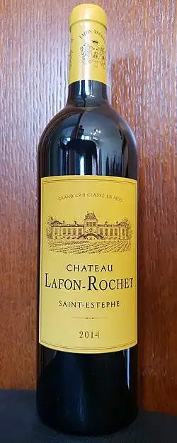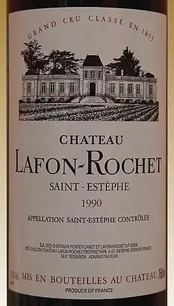 Château Lafon-Rochet is a winery in the Saint-Estèphe appellation of the Bordeaux region of France. The wine produced here was classified as one of ten Quatrièmes Crus (Fourth Growths) in the historic Bordeaux Wine Official Classification of 1855. [1] The Chateau has 111 acres (45 ha) planted with Cabernet Sauvignon, Merlot, Cabernet Franc and Petit Verdot. A second wine is produced under the label Les Pelerins de Lafon-Rochet. The Chateau is owned by the Tesseron family who made their fortune in the Cognac trade and also own Château Pontet-Canet.[2]