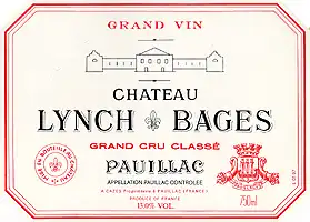 Château Lynch-Bages is a winery in the Pauillac appellation of the Bordeaux region of France. Château Lynch-Bages is also the name of the red wine produced by this property. The wine produced here was classified as one of eighteen Cinquièmes Crus (Fifth Growths) in the Bordeaux Wine Official Classification of 1855.[1]