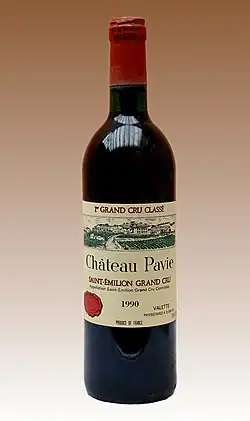 Château Pavie is a winery in Saint-Émilion in the Bordeaux region of France. It lies on the plateau to the southeast of St. Emilion village. In 2012 it was classified in the first rank of the Classification of Saint-Émilion wine, as a Premier Grand Cru Classé (A), after having previously been a Premier Grand Cru Classé (B) since 1954.
