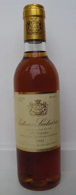 Château Suduiraut, formerly Cru du Roy and Château de Suduiraut, is a sweet white wine ranked as Premier Cru Classé (French, “First Growth”) in the original Bordeaux Wine Official Classification of 1855. Belonging to the Sauternes appellation in Gironde, in the region of Graves, the winery is located in Preignac, adjacent to Château d'Yquem.