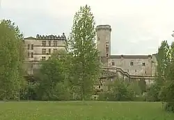 The Château de Bourdeilles is a castle located in the commune of Bourdeilles in the Dordogne département in southwestern France. A castle may have existed at Bourdeilles in the 9th century, but the oldest parts of the current castle date from the early 14th century. The castle consists of an octagonal keep, connected to a two-story building of which only the outer walls remain. Next to the old castle, a Renaissance palace was built at the end of the 16th century. Much of the interior decoration has been preserved. The castle and the palace are surrounded by a wall. The entrance gate is protected by two round towers. Since 1919, the château has been listed as a monument historique by the French Ministry of Culture.[1]