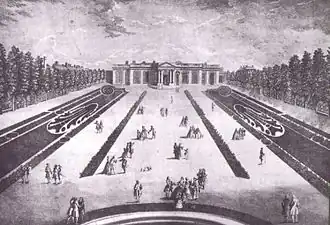 The Château de Choisy was set in an elaborate series of gardens laid out by André Le Nôtre. He was called in before the few existing buildings were swept away and found the site too closed in by dense woodlands: "There one only saw the riverbank as if through a dormer window,"[3] he told the king—who passed on the remark— and advised Mlle de Montpensier to begin in this "vilaine situation" by "laying low all the woods that were there".[4] The view of the river was the main thing, and Mlle de Montpensier calculated it to advantage: "As I had my house built in order to go there in summer, I took measures in order that one might see the river in the time of year when it is at its lowest; from my bed I see it and all the boats that pass."[5]