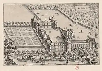 It was a favorite royal residence again under Henry IV of France (1553–1610), who liked to hunt here.[1] Also, he spent quality time here with his mistress and confidante, Gabrielle d'Estrées (1573–1599). Further, in January 1596, the Edict of Folembray was signed at the château, a peace treaty between Henri IV and Charles, Duke of Mayenne (1554–1611), a leader of the Catholic League.[3] As a result, the duke of Mayenne submitted to the French king and retained Chalons, Seurre and Soissons for six years.[3]