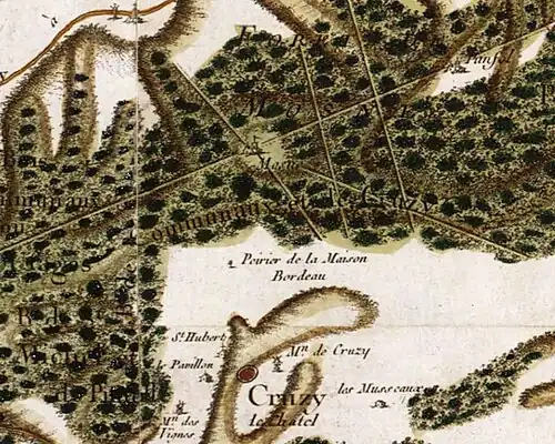 It lies on the edge of a large plateau of farmland that was once covered with forests. The 18th-century Cassini map shows the château surrounded by a vast forest, in a clearing at the intersection of five forest paths. These paths allowed for ease of logging and hunting, and also created a view of the château. The château has three predictable streams of water, providing water to the premises.