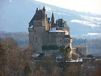 The Château de Menthon is a medieval castle located in the commune of Menthon-Saint-Bernard, 12 kilometres (7.5 mi) south of Annecy in the Haute-Savoie department of France. Standing on a 200 metres (660 ft) tall rock, its stone towers loom over Lake Annecy, the Roc de Chère National Nature Reserve, and Menthon-Saint-Bernard. Since 1989, it has been listed as a monument historique by the French Ministry of Culture.[1]