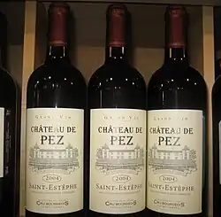 Château de Pez is a vineyard located across the road from Château Calon-Ségur, in the northern parts of Saint Estèphe. Traditionally one of the leading Bourgeois Supérieur wines of the Médoc, it is believed by some to deserve higher classification.[1] In a 2003 Cru Bourgeois classification revision, it was listed as one of nine Cru Bourgeois Exceptionnels.[2] It has a reputation of consistently producing wine that is both inexpensive and good.[1]