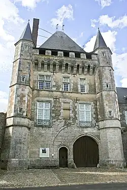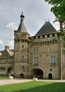 There are no accurate records currently available as to the extent of the building at this time, but a later drawing shows two wings, on either side of the tower. The east wing also extended north to meet the church. This section was known to have been further extended in 1638 by Isabelle Salviati whilst the church was being worked on.[21] The west wing was destroyed in a fire in 1723.[22] The joining edge can be seen on the northwest corner of the tower. The two wings and tower enclosed the great courtyard of the chateau that contains the well.[23] This is covered with a distinctive roof held on stone columns built in 1814 that has become emblematic of the chateau.