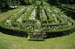 - The regular labyrinth is a mass of yew hedging and white rose bushes in the lawn.