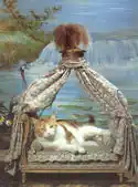 In a room next to the kitchen is a unique collection of pet-carriers, baskets and kennels. Small dogs and cats were the object of much care and attention, as testified by the refinement and variety of sumptuous places in which they lived, slept and travelled. Some were even provided with bedding matched to the full-sized furniture of the room in which they were placed, others were miniature versions of the furniture, but gilded. Some of the very ornate kennels had three compartments. The cat's bed, in the photograph opposite, is à la polonaise with a dais and drawn-up curtains, and was made for one of the daughters of Louis XV of France for her pet. Louis XV himself had a King Charles Spaniel called Filou (Rascal). Its bed was a cushion of crimson velvet and it wore a gold collar encrusted with diamonds. Louis XV said of his dog: “He’s the only thing in the world that likes me for myself”. These small ‘pet-dwellings’ are extremely rare and unusual reminders of times past, when pets were often looked after better than the workers of the estate.