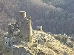 The Château du Tournel is a ruined feudal castle in the commune of Saint-Julien-du-Tournel in the Lozère département of France. A former seat of the Barons of Tournel, one of the eight baronies of Gévaudan, it was destroyed during the French Wars of Religion by Huguenot troops under Matthieu Merle.