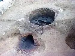 Many structures resembling wells, with a maximum depth of six meters and some exhibiting indications of wooden lining, have been identified on the plateau. In the absence of an existing or fossil water table, it is more probable that these were cisterns intended to collect runoff water.[L 34] A well with a depth of five meters was previously reported in 1890; however, its precise location on the site was not identified.[54] Other partially or completely buried structures are interpreted as cellars for smaller ones and as larger storage caves.[L 35]