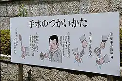 At shrines, these chōzubachi are used by a worshipper to wash their left hand, right hand, mouth and finally the handle of the water ladle to purify themselves before approaching the main Shinto shrine or shaden (社殿).[2] This symbolic purification is normal before worship and all manned shrines have this facility,[3] as well as many Buddhist temples[4] and some new religious houses of worship. The temizu-ya is usually an open area where clear water fills one or various stone basins. Dippers (hishaku (杓)) are usually available to worshippers. In the 1990s, water for temizu at shrines was sometimes from domestic wells, and sometimes from the municipal supply.[5]