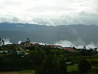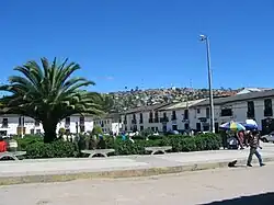 Jiron Triunfo is the street which links the three principal plazas of the city. It is called by this name because the victorious Chachapoyans of the Higos Urco battle entered the city through here.[4] Chacapoyas' transitional location between the arid Cordillera Occidental and Cordillera Central and the rainy, rainforested Cordillera Oriental, allow it to receive a generally moderate annual precipitation amount without receiving the copiously excessive, tropical-rainforest-like precipitation amounts farther east in towns such as Moyobamba.