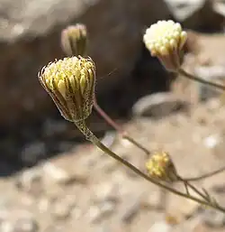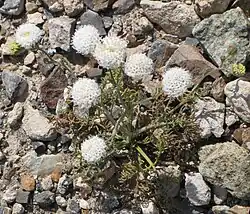 Chaenactis carphoclinia, or pebble pincushion, is an annual herb growing an erect, branching stem up to about 60 centimeters (2 feet) in maximum height. The longest leaves are about 10 centimeters (4 inches) long and are usually divided into a few lobes. The inflorescence bears a few flower heads, each up to a centimeter wide. The head is lined with flat, sharp-pointed phyllaries which are reddish. The head contains several white or pink-tinted flowers with long, protruding anthers. The fruit is an achene a few millimeters in length tipped with a scaly pappus.[4]