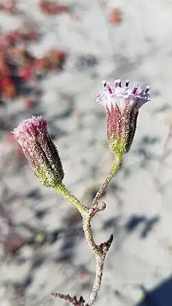 Chaenactis lacera is a branching annual sometimes exceeding 30 cm (12 inches) in height. Flower heads are numerous, with white disc florets but no ray florets.[2][3]