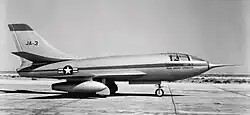 Principal filming took place from April 16, 1949 to July 1949, but final production was held back from release until 1950. In order to realistically depict the flight testing, permission was obtained to film at various Air Force bases, including Muroc Army Air Field (now Edwards Air Force Base). Location shooting also occurred at the San Fernando Valley Airport (now Van Nuys Airport).[4] A realistic full-scale JA-3/JA-4 model created by Paul Mantz, the aerial sequence director,[4] was built for $15,000. The origins of the film model stemmed from a derelict Bell P-39 Airacobra fuselage that had been reworked by Vince Johnson, an expert "lofter".[5] The Warner Bros. contract called for completion of a realistic (if futuristic) fighter able to taxi and deploy parachutes. Besides the full-scale model used for most of the ground sequences, a number of scale models were built. A Willis JA-3 fibreglass miniature used in the production, measuring 80 in. long and a wingspan of 59 in., was auctioned in 2009 for $1,300.[6]