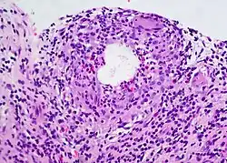 Treatment is initiated with warm compresses.[2] In addition, antibiotic/corticosteroid eyedrops or ointment may be used. If this is not effective, injecting corticosteroids into the lesion may be tried.[2] If the granuloma is large, incision and drainage may be recommended.[2] While relatively common, the frequency of the condition is unknown.[3] It is most common in people 30–50 years of age, and equally common in males and females.[9] The term is from Ancient Greek χαλάζιον (khalazion) 'small hailstone'.[10]