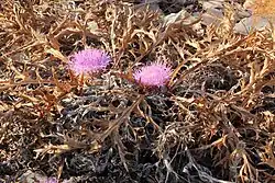 Chamaeleon gummifer, also known as distaff thistle, piney thistle[3] or stemless atractylis, is a thistle in the Chamaeleon genus. Formerly, it was placed in the Atractylis genus.[1] It is native to the Mediterranean basin, where it can be found in various habitats, including cultivated- or uncultivated fields and forests.[4][1] It is a perennial herb producing a stemless, pinkish flower. The plant has a history of use in folk medicine, but it is very toxic due to the presence of atractyloside and carboxyatractyloside.[5]