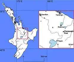 Champagne Pool is a prominent geothermal feature within the Waiotapu geothermal area in the North Island of New Zealand. The terrestrial hot spring is located about 30 km (20 mi) southeast of Rotorua and about 50 km (30 mi) northeast of Taupō. The name Champagne Pool is derived from the abundant efflux of carbon dioxide (CO2), similar to a glass of bubbling champagne. The hot spring was formed 900 years ago by a hydrothermal eruption,[1] which makes it in geological terms a relatively young system. Its crater is about 65 m (213 ft) in diameter with a maximum depth around 62 m (203 ft) and is filled with an estimated volume of 50,000 m3 (1,800,000 cu ft) of geothermal fluid.[2]
